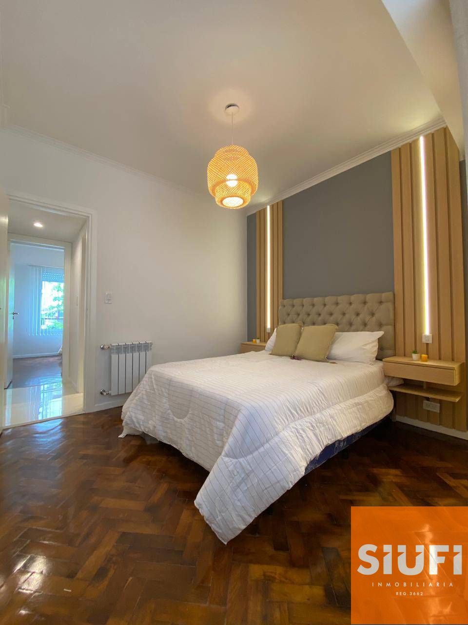 Dormitorio principal con pisos de parquet pulido y plastificado a la calle, placard a medida