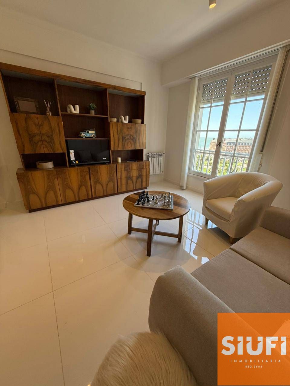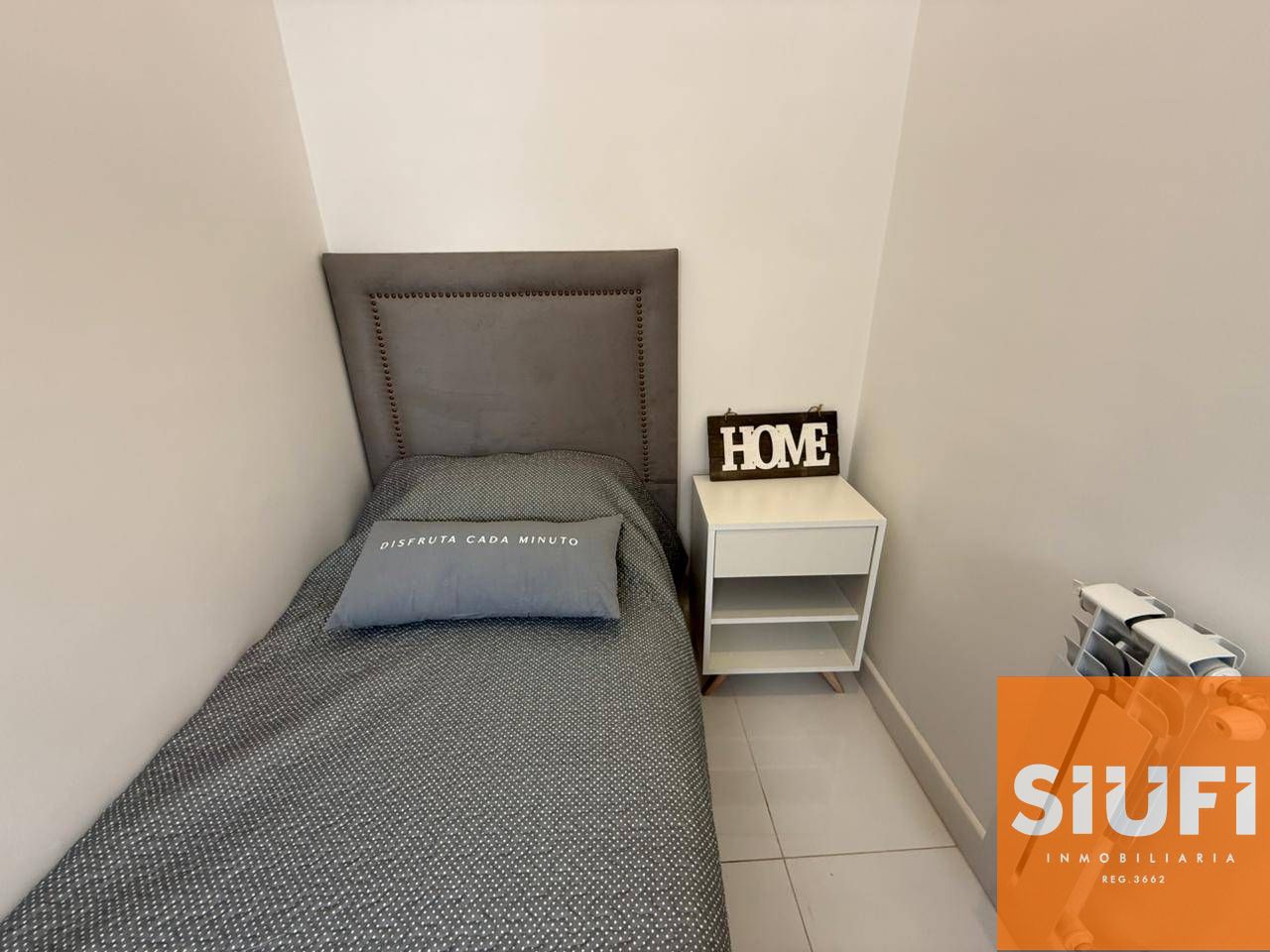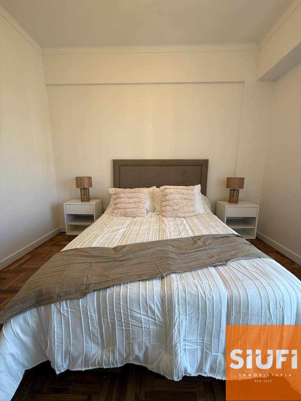 Dormitorio con pisos parquet pulido, lustrado y plastificado, con amplio placard de 6 hojas. Con sommier de 2 plazas, respaldo de cama y mesas de luz, vista al mar